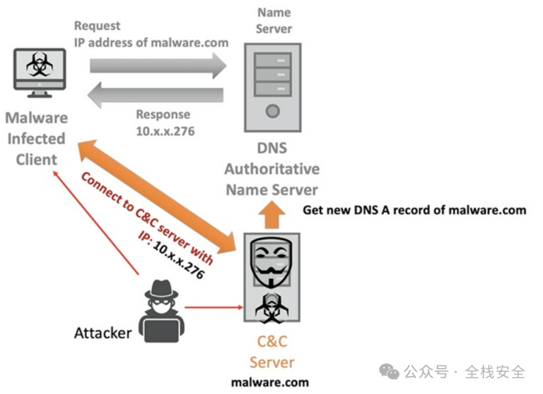 虽然DNS隧道可以用于以上合法用途,但它经常被用于恶意目的。DNS隧道在僵尸网络和APT攻击中应用比较广泛,用于C&C服务器(攻击者)和C&C客户端(受害者)之间的隐蔽通信,从而实现远程控制和文件传输等操作,同时可减少被拦截发现的概率。