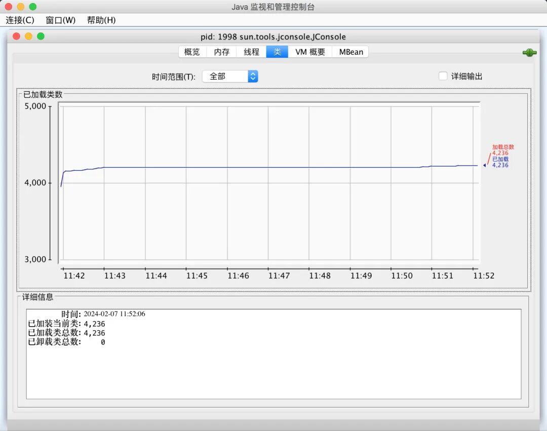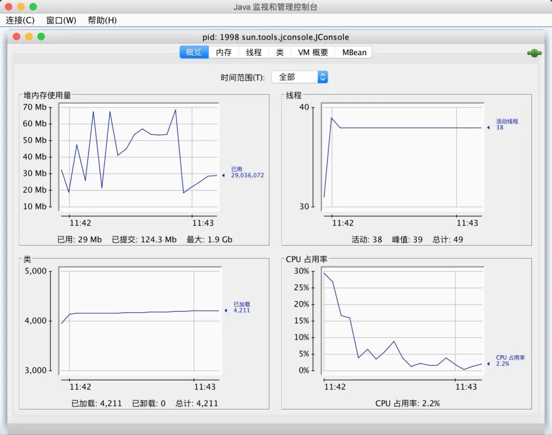 进入之后,就可以看到 jconsole 概览图和主要的功能,例如概述、内存、线程、类、VM、MBean 等板块。概览界面如下。