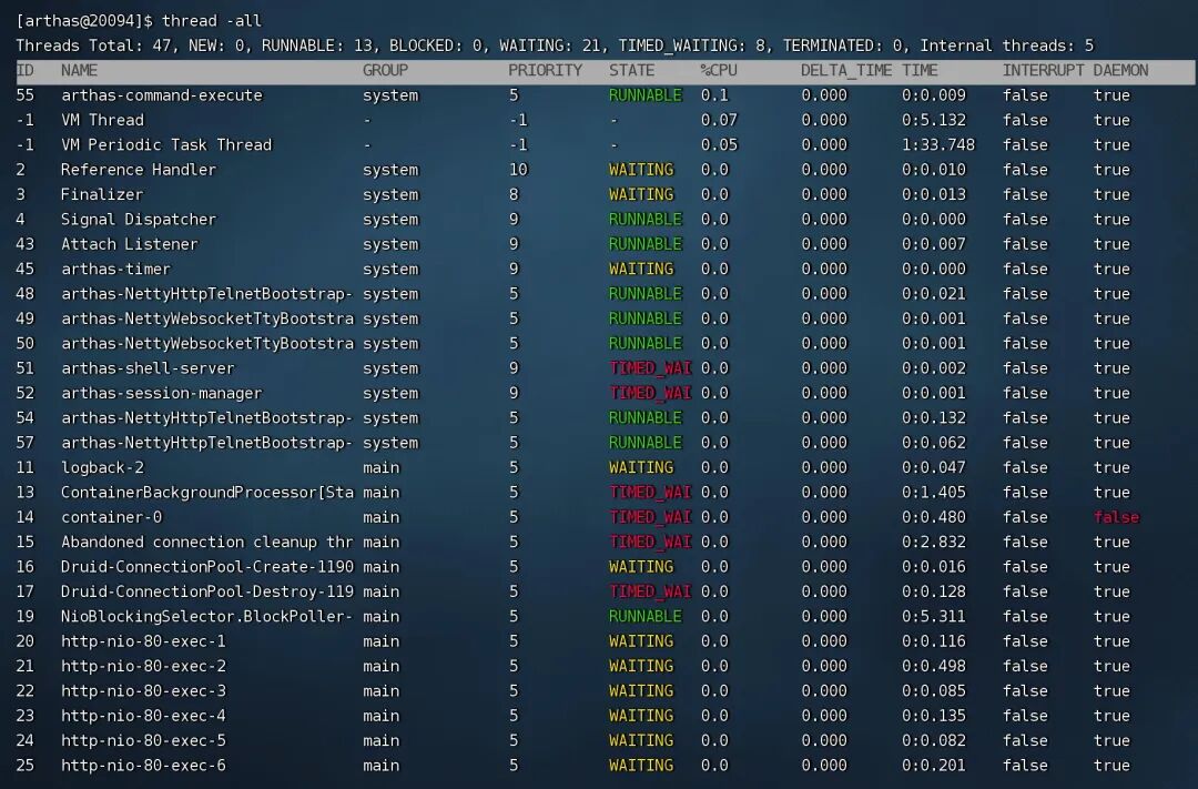 点击“线程 Dump”按钮之后,就会生成一份当前时刻的线程快照,在界面上可以查询线程的状态。界面如下。