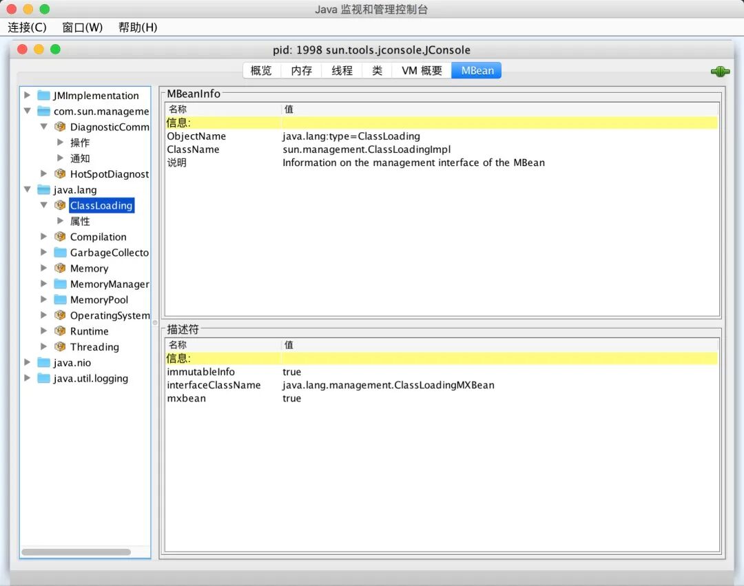 MBean 板块主要展示被管理的 Bean 的属性,方法等。界面如下。