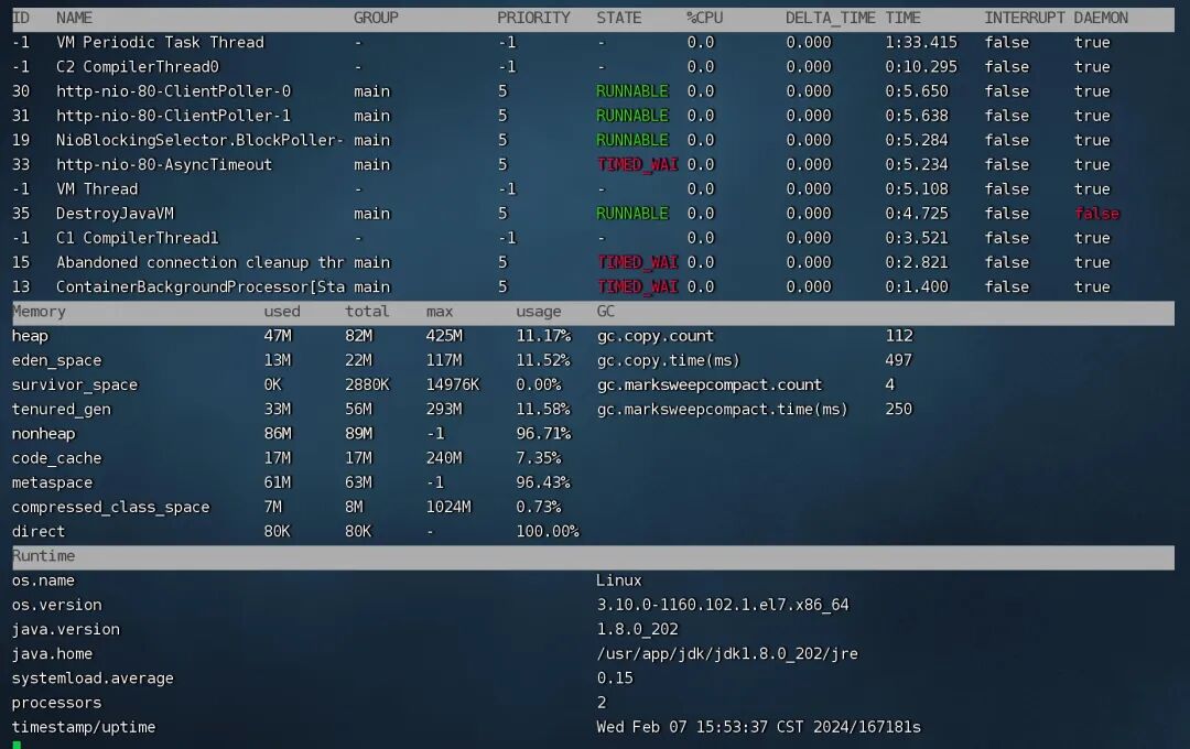 回车之后,一共有三块信息,分别是线程信息、内存信息、运行时信息,界面如下。
