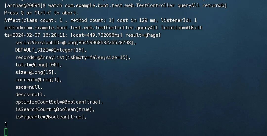 某些场景下我们想要观察某个方法的返回结果,以便判断是否符合预期效果,可以通过 watch 命令来实现,例如观察TestController类的queryAll()方法的返回结果,命令如下。