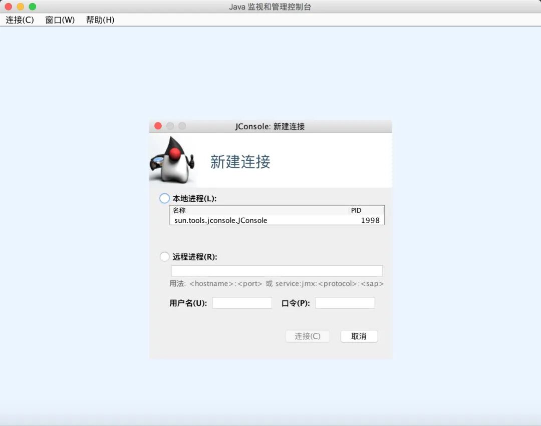 在命令行输入jconsole即可启动。如果 Windows 用户,也可以在 jdk 的安装目录的 bin 目录下,找到jconsole.exe,双击启动。界面如下。