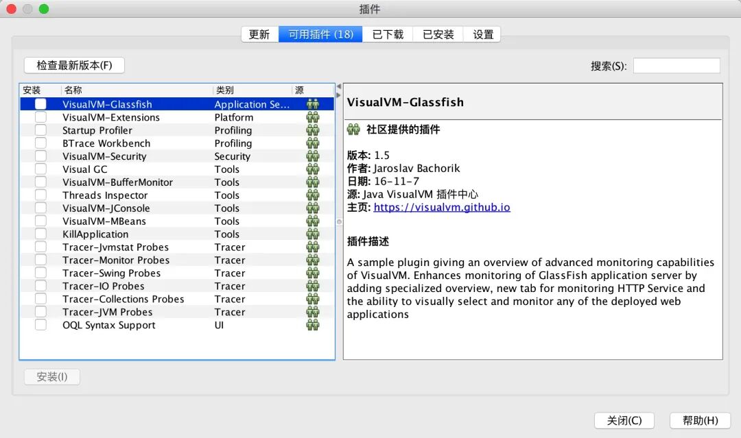 VisualVM 还有一大亮点,就是它支持插件安装。每个插件的关注点都不同,有的是监控 GC,有的是监控内存,有的是监控线程等,可以在插件市场上寻找对应的工具进行安装,以便更好的排查服务性能问题。