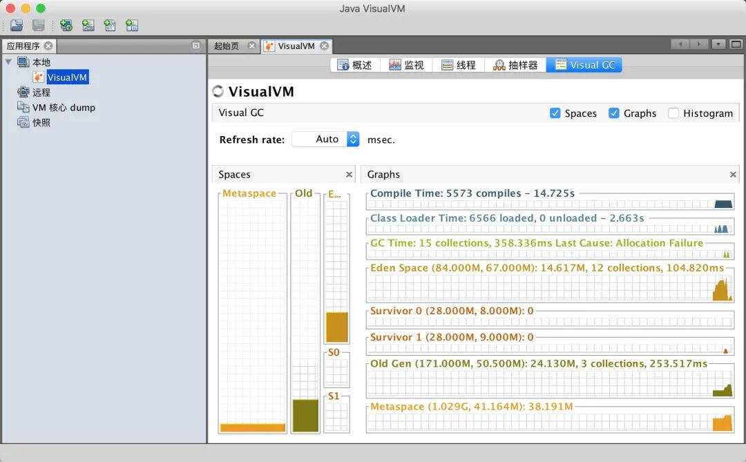 通常,我们会将 Visual GC 插件安装到 VisualVM 中,利用它可以更加直观的观察到整个垃圾回收的过程。界面如下。