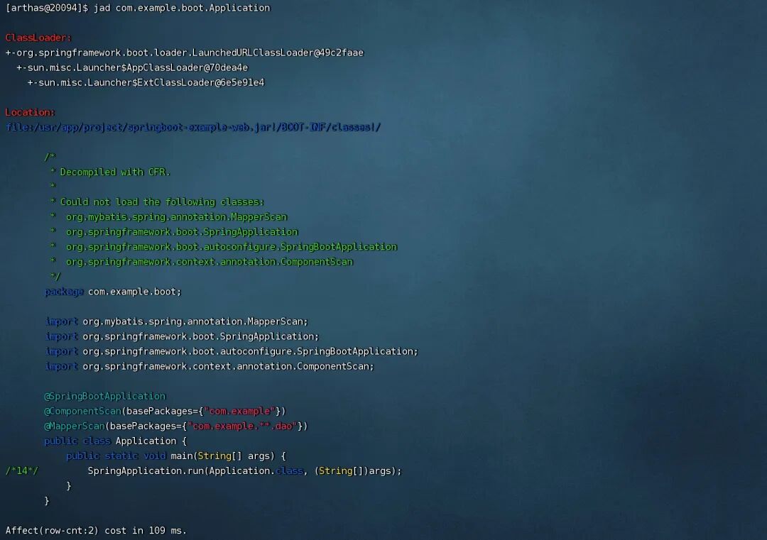 某些时候我们想要查询线上的源码是否正确发布,可以通过 jad 命令来反编译类,以此来查询源码信息,例如反编译Application类,命令如下。