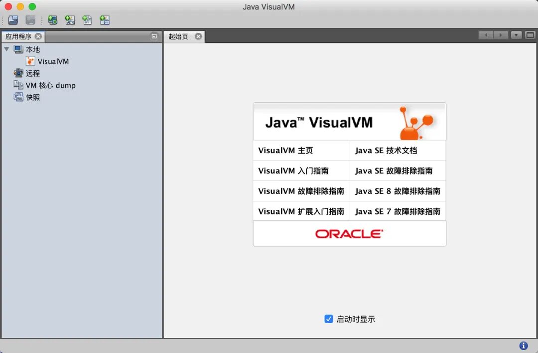 在命令行输入jvisualvm即可启动。如果 Windows 用户,也可以在 jdk 的安装目录的 bin 目录下,找到jvisualvm.exe,双击启动。界面如下。