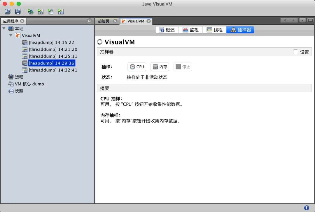 抽样器板块可以对 CPU、内存在一段时间内进行数据抽样,以供分析。界面如下。