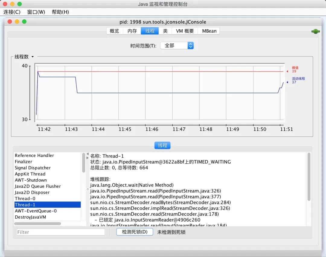 线程板块主要展示线程数的活动数和峰值,点击左下方线程可以查看线程的详细信息,比如线程的状态是什么,堆栈内容等,同时也可以点击“检测死锁”来检查线程之间是否有死锁的情况。界面如下。