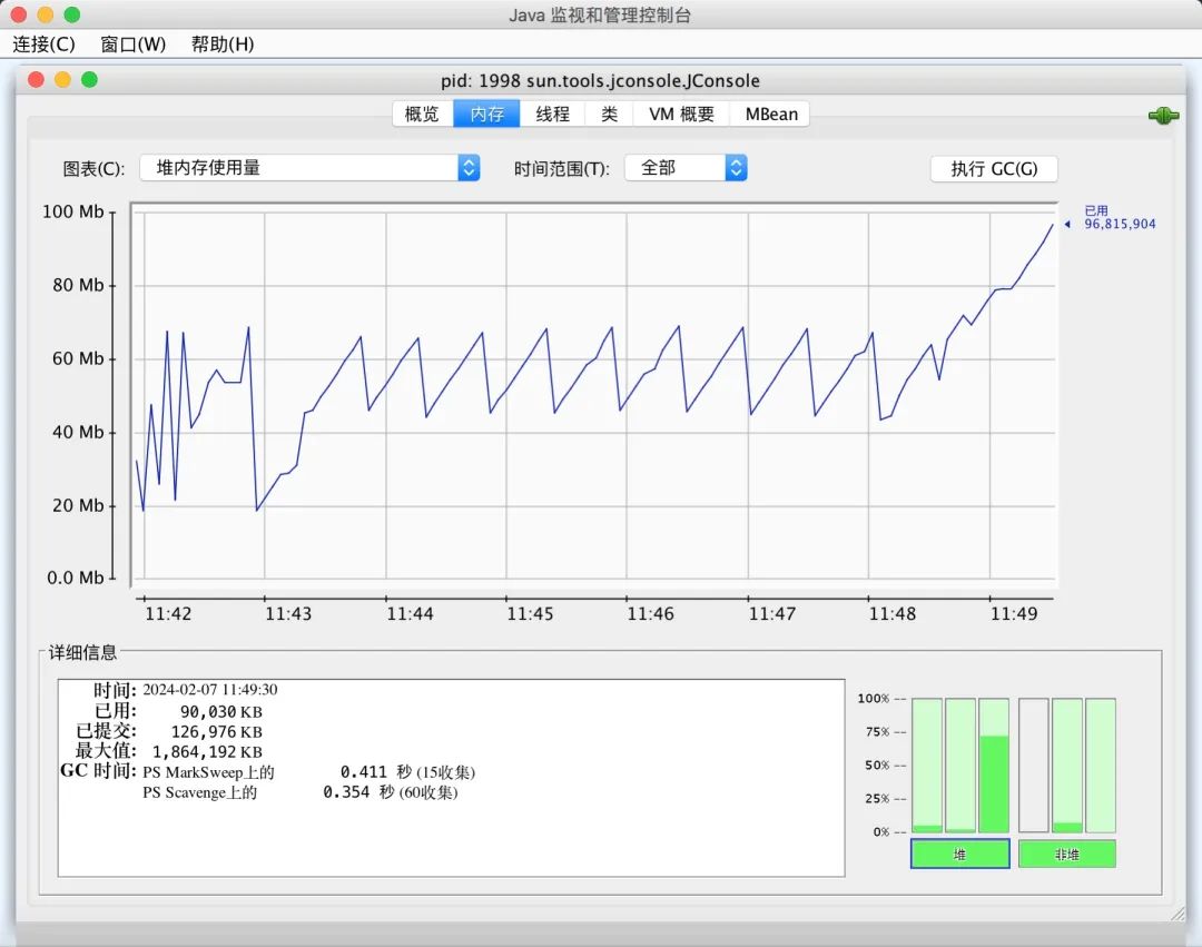 内存板块主要展示了内存的使用情况,同时可以查看堆和非堆内存的变化值对比,也可以点击执行 GC 来触发 GC 的执行。界面如下。