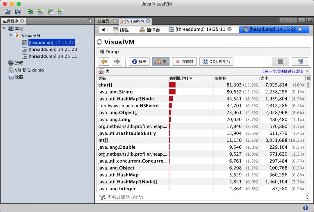 点击“堆 Dump”按钮之后,就会生成一份当前时刻的堆文件快照,在界面上可以查询当前文件的对象大小分析结果。界面如下。