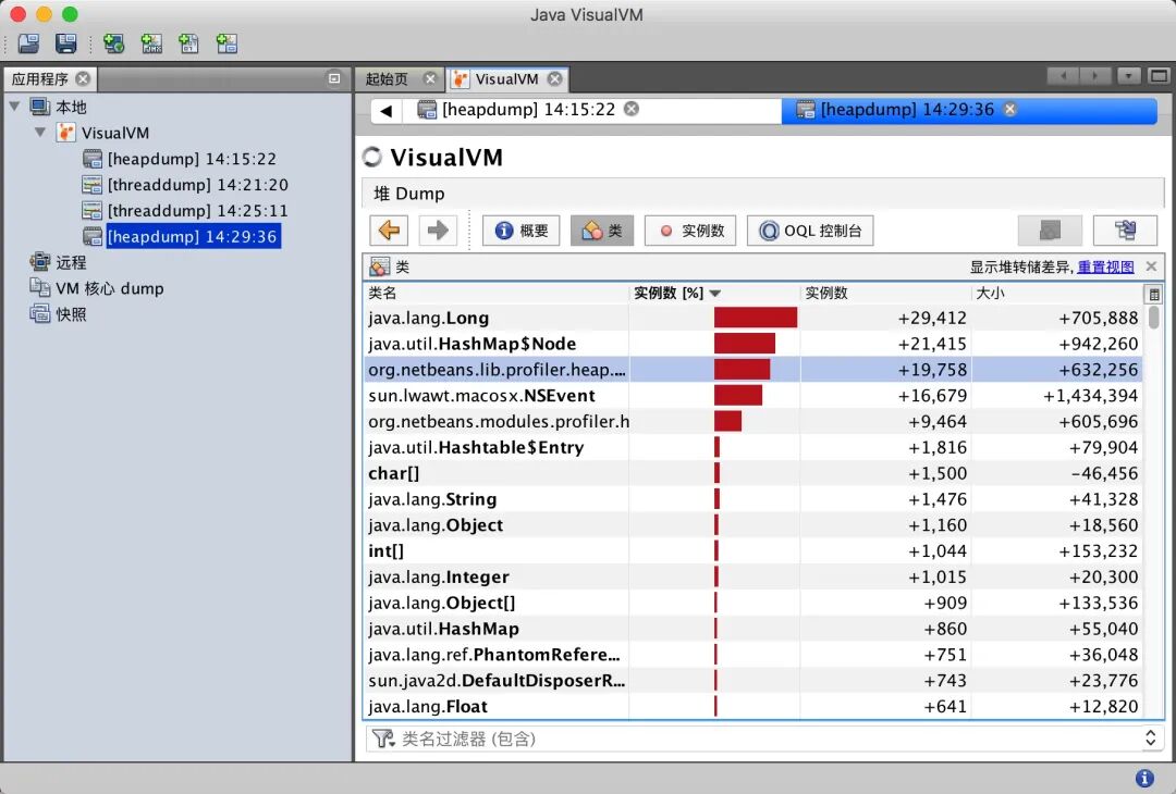 同时还支持与另一个堆文件进行比较,展示差异信息。界面如下。