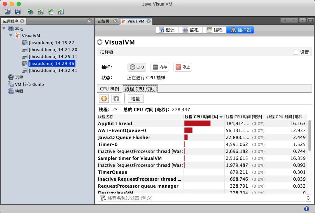 比如,点击“CPU”按钮之后,可以实时的查询线程和方法占用 CPU 时间长短排名,点击“停止”按钮即可结束抽样。