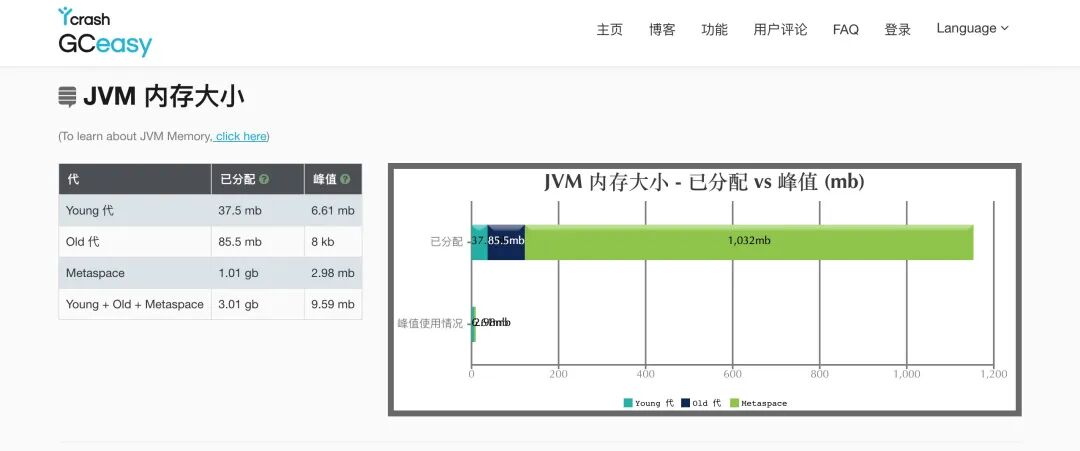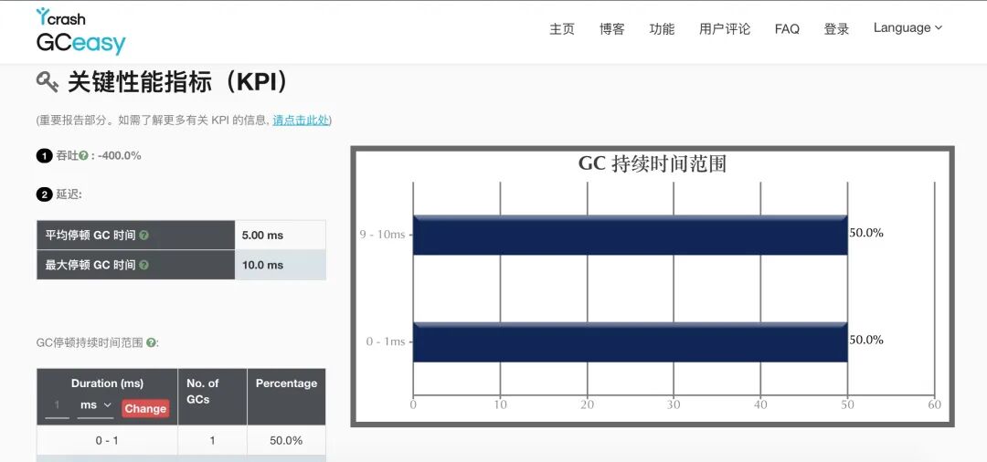 最后,将导出的 gc 日志,上传到 GCeasy 中,即可实时统计出相关的 gc 信息。