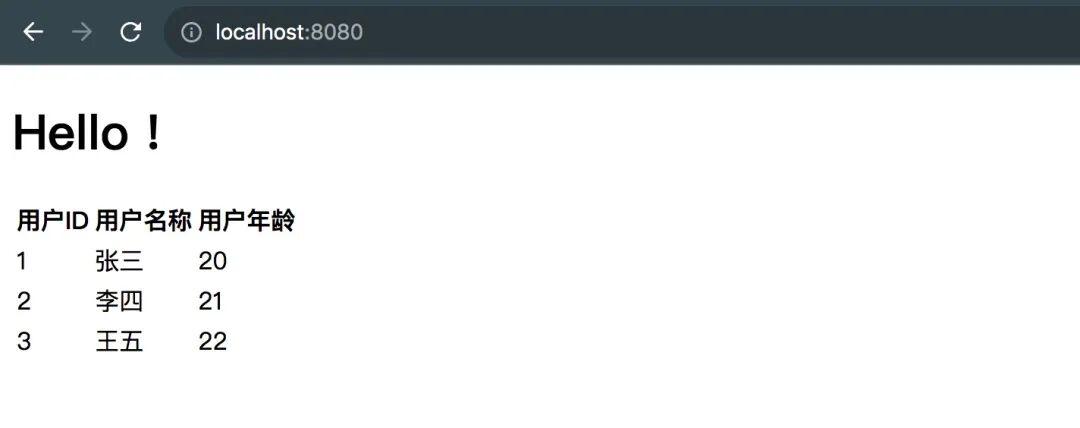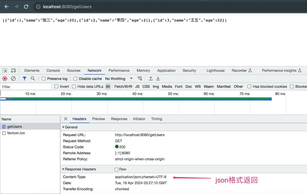 将服务启动,访问http://localhost:8080/getUsers,控制台输出结果如下。