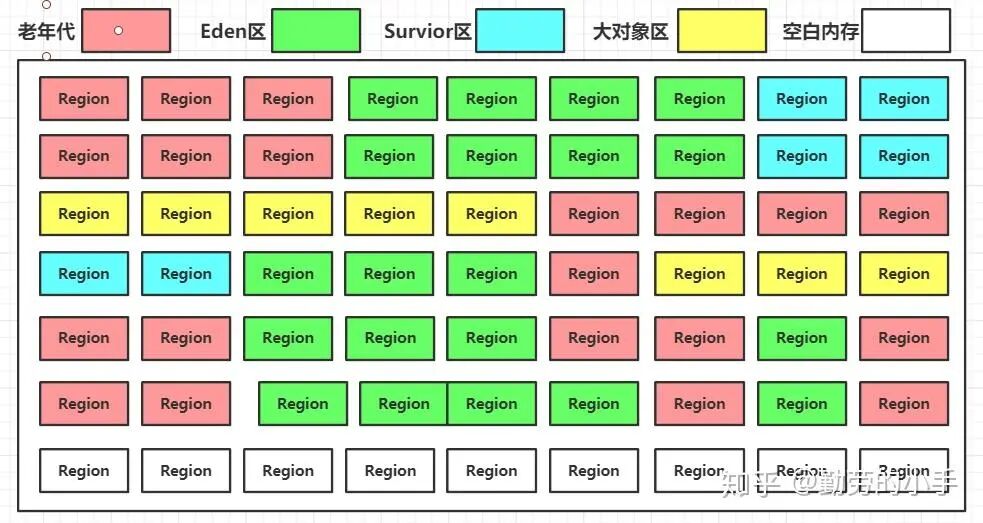 G1 收集器内存划分,可以用如下图来概括。(图片来自于勤劳的小手 – 垃圾收集器文章)
