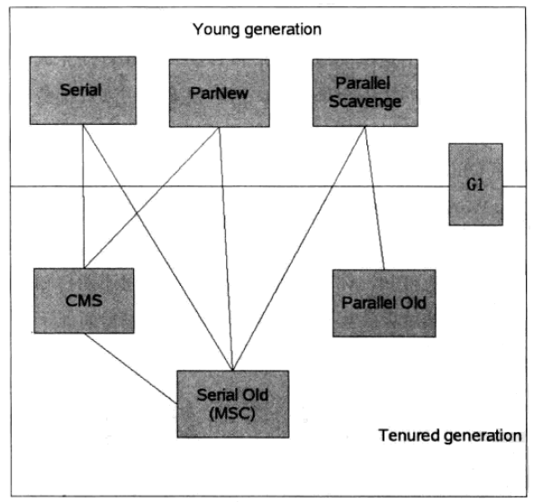 - 新生代收集器:Serial、ParNew、Parallel Scavenge