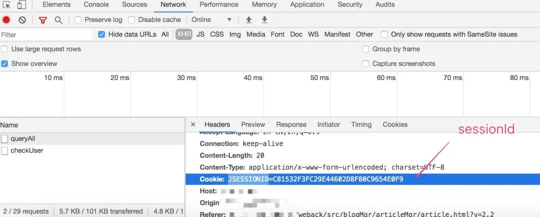当浏览器再次发送请求时,会在请求头部的cookie中放入sessionId,将请求数据一并发送给服务器。