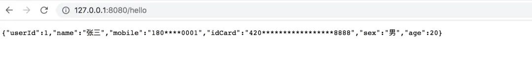 {"userId":1,"name":"张三","mobile":"180****0001","idCard":"420*****************8888","sex":"男","age":20}
