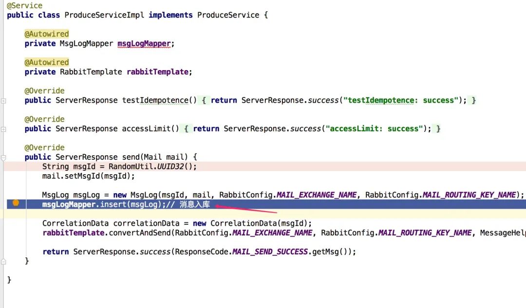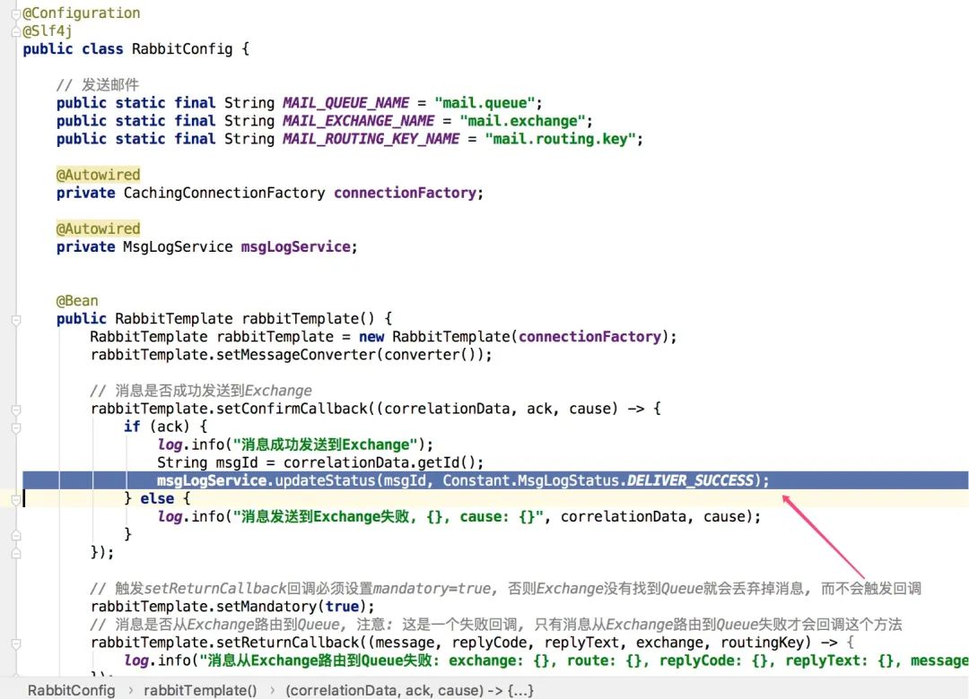 同时,在RabbitConfig服务配置,当消息发送成功之后,新增更新消息状态逻辑。