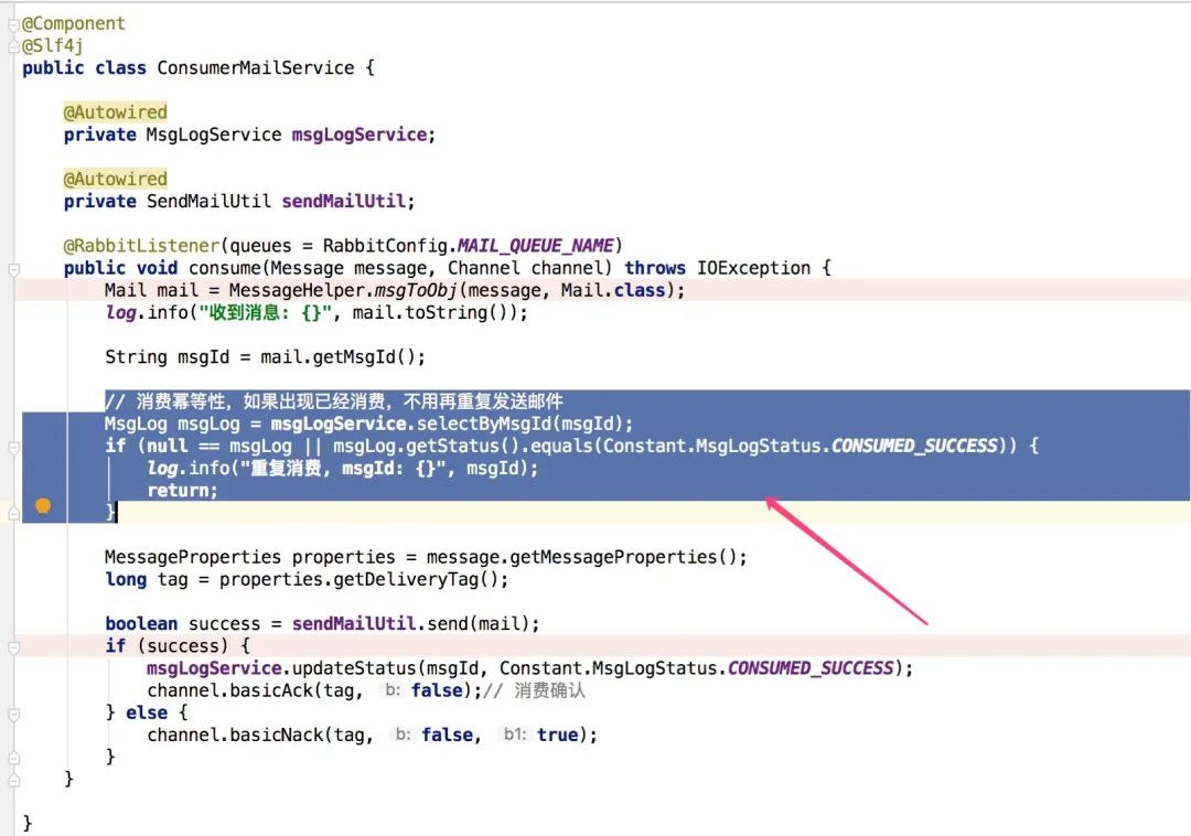 改造消费者ConsumerMailService,每次消费的时候,从数据库中查询,如果消息已经被消费,不用再重复发送数据!