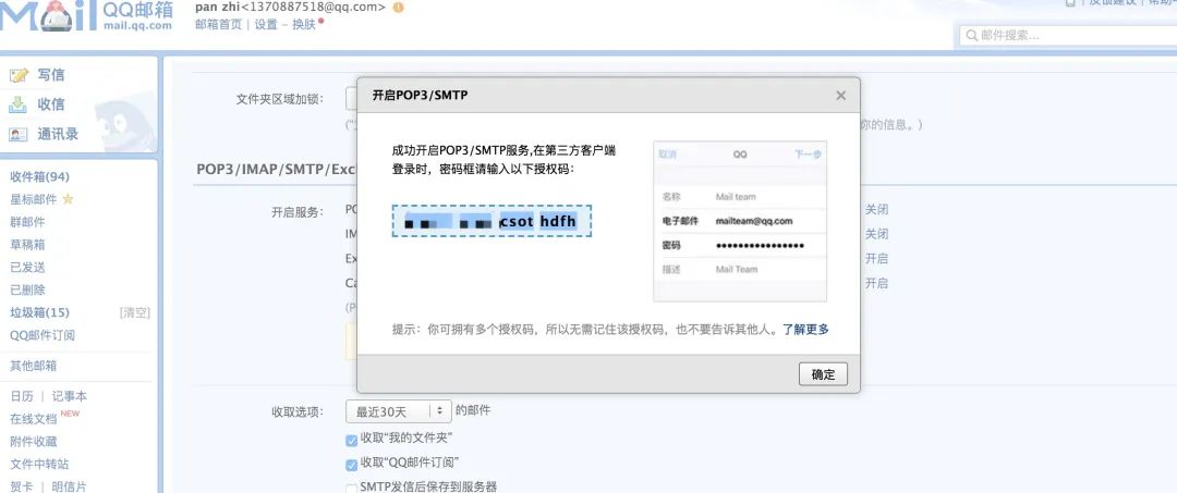 获取邮箱授权码的目的,主要是为了通过代码进行发送邮件,例如 QQ 邮箱授权码获取方式,如下图: