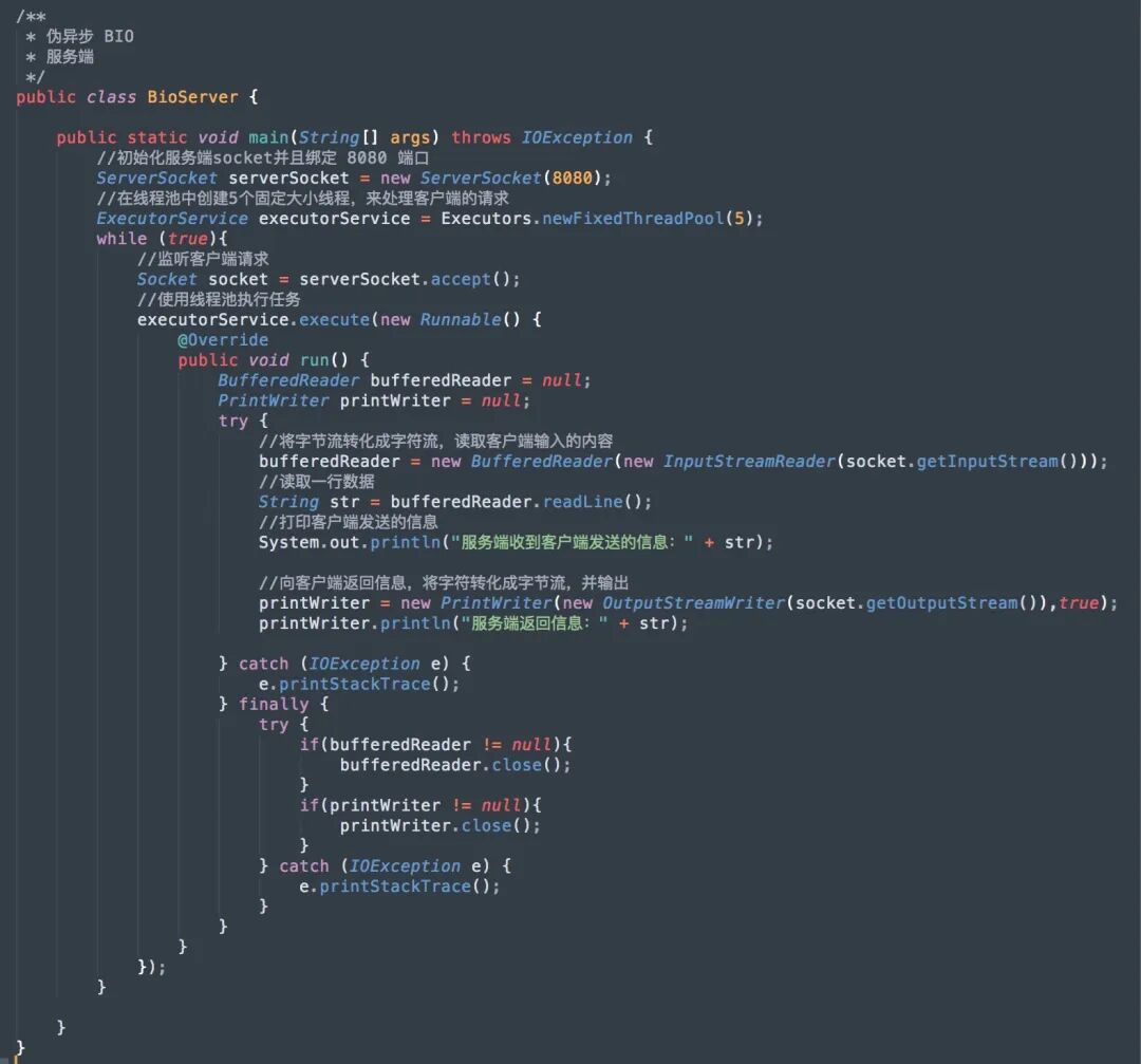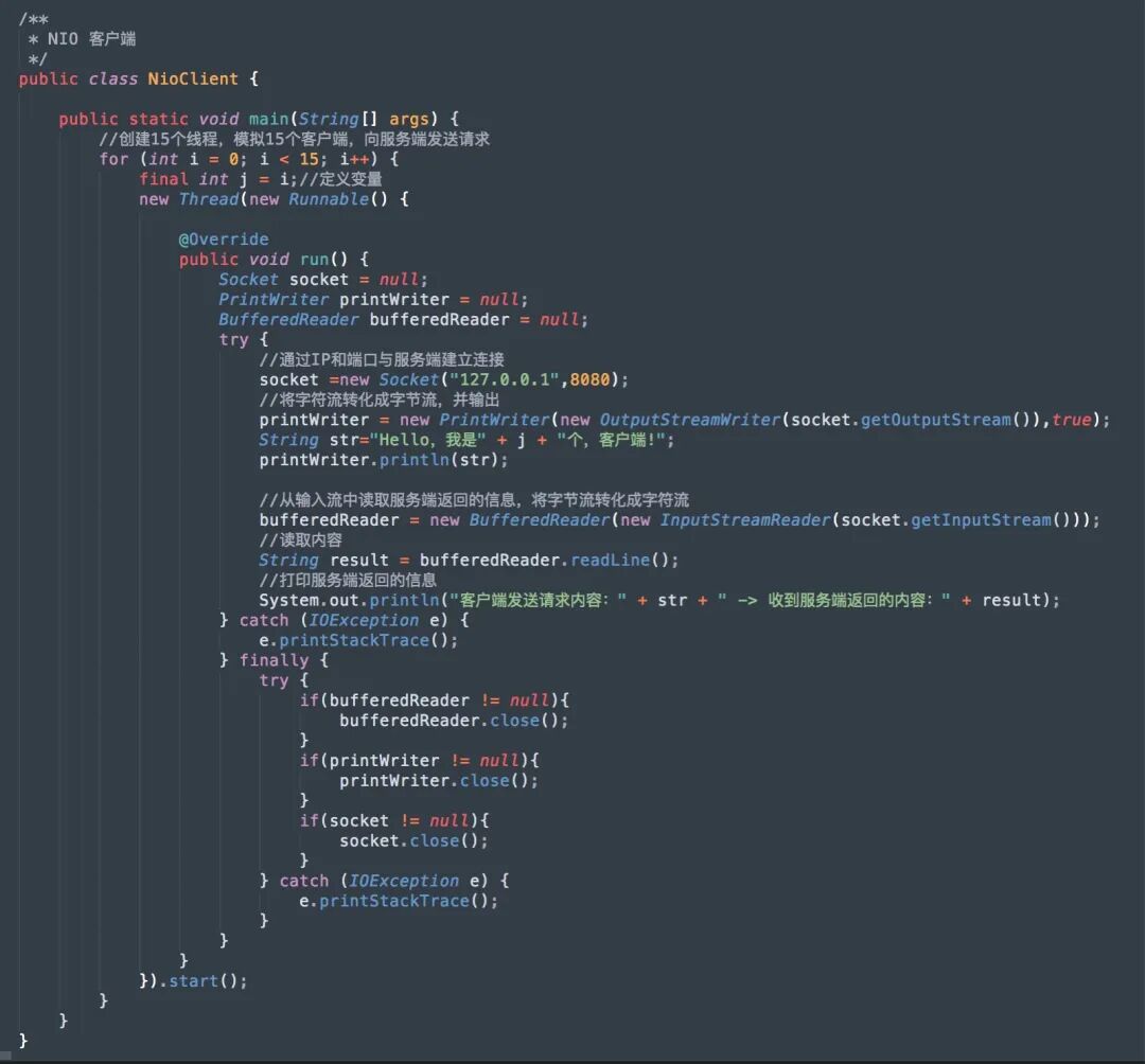 如果要让 BIO 通信模型能够同时处理多个客户端请求,就必须使用多线程,也就是说它在接收到客户端连接请求之后为每个客户端创建一个新的线程进行链路处理,处理完成之后,通过输出流返回应答给客户端,线程销毁。
