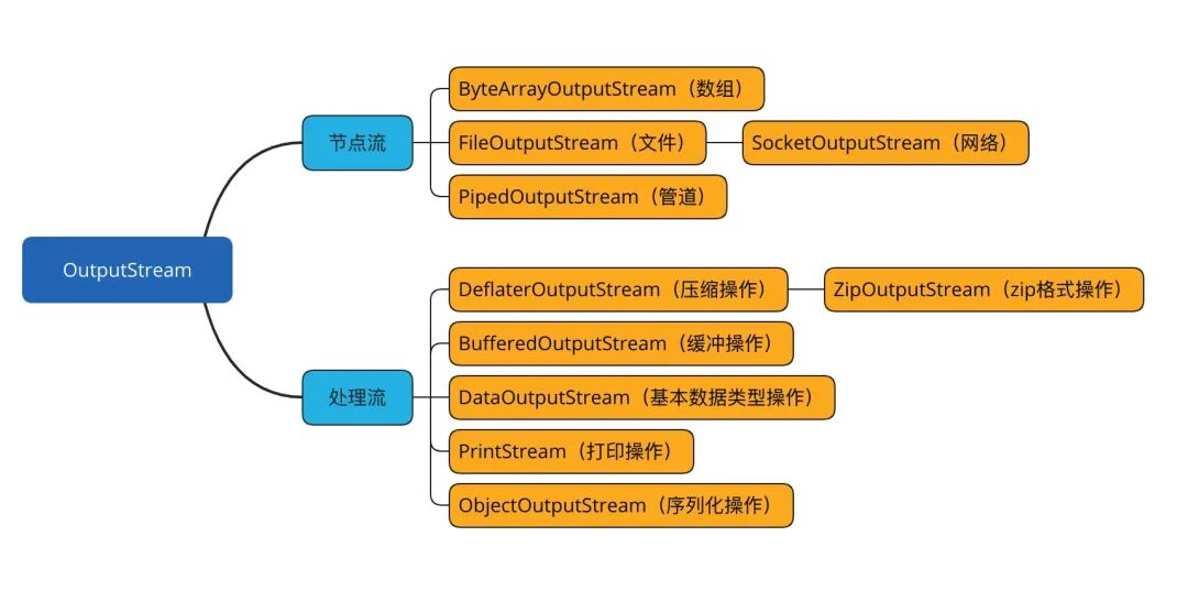 同样的,输出流根据数据节点类型和处理方式分类,分别可以划分出了若干个子类,如下图: