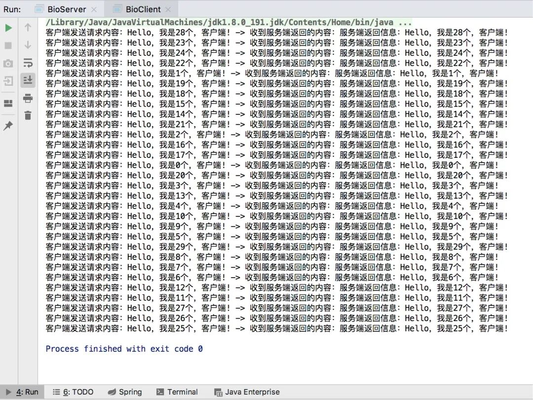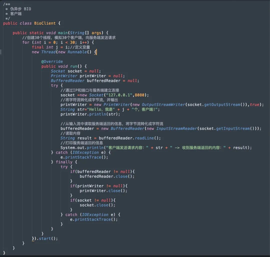 本例中测试的客户端数量是 30,服务端使用 java 线程池来处理任务,线程数量为 5 个,服务端不用为每个客户端都创建一个线程,由于线程池可以设置消息队列的大小和最大线程数,因此,它的资源占用是可控的,无论多少个客户端并发访问,都不会导致资源的耗尽和宕机。