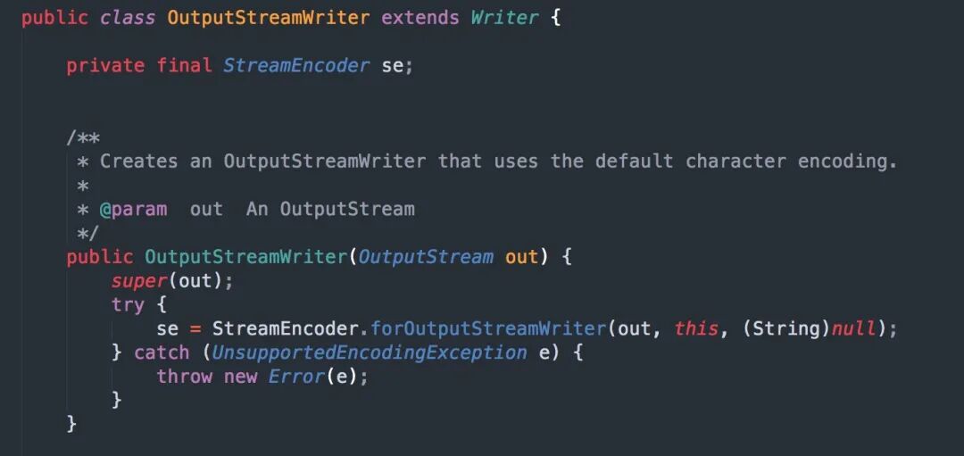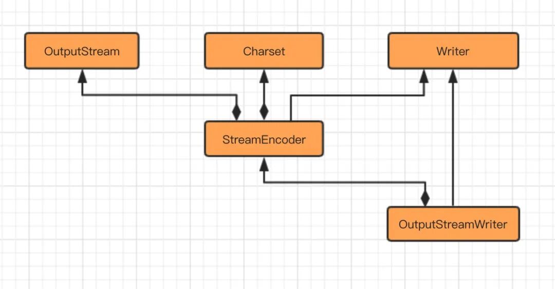 通过 OutputStreamWriter 类完成字符到字节的编码过程,由 StreamEncoder 完成编码过程。