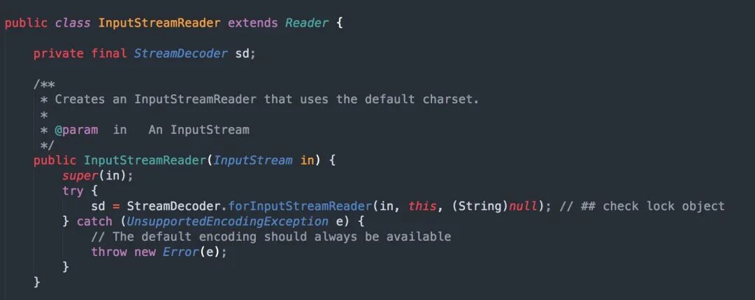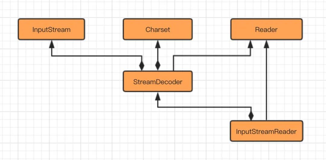InputStream 到 Reader 的过程需要指定编码字符集,否则将采用操作系统默认字符集,很可能会出现乱码问题,StreamDecoder 则是完成字节到字符的解码的实现类。