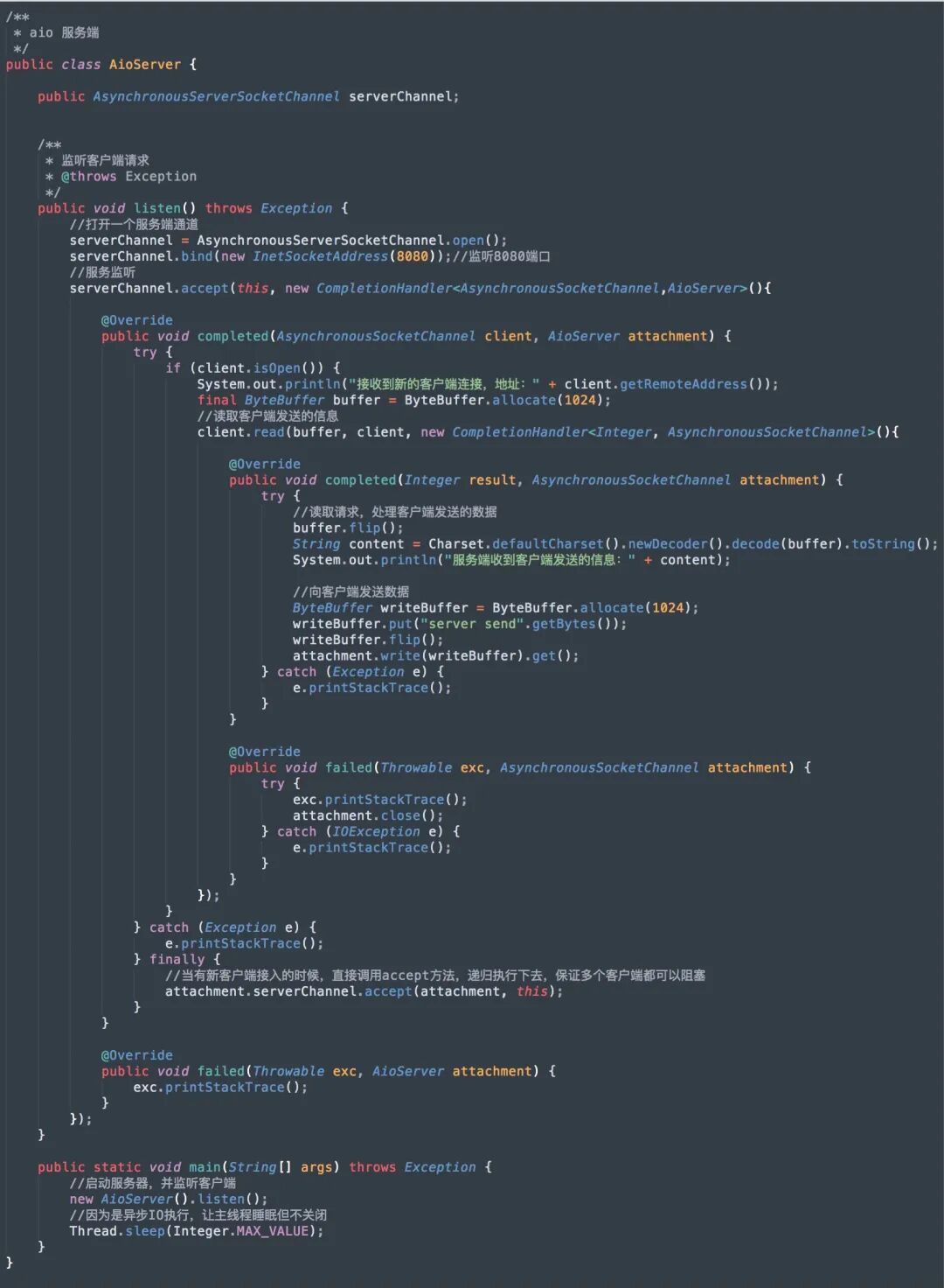 最后就是 AIO 了,全称 Asynchronous I/O,可以理解为异步 IO,也被称为 NIO 2,在 Java 7 中引入了 NIO 的改进版 NIO 2,它是异步非阻塞的 IO 模型,也就是我们现在所说的 AIO。