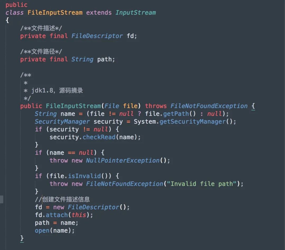 紧接着,会创建一个FileDescriptor的对象,其实这个对象就是真正代表一个存在的文件对象的描述。可以通过FileInputStream对象调用getFD() 方法获取真正与底层操作系统关联的文件描述。