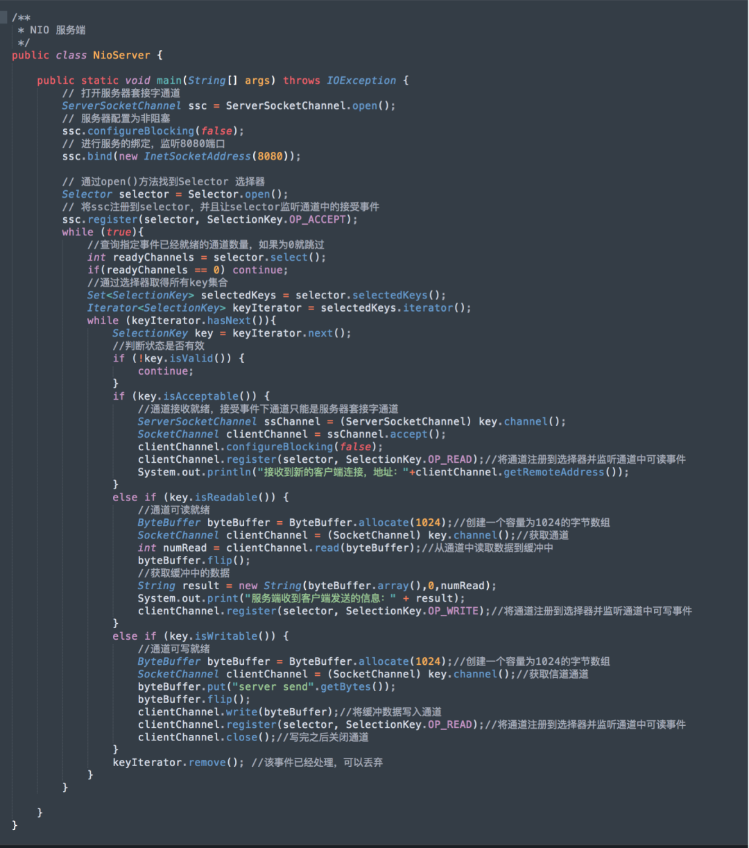 NIO 提供了与传统 BIO 模型中的 SocketServerSocket 相对应的 SocketChannelServerSocketChannel 两种不同的套接字通道实现。