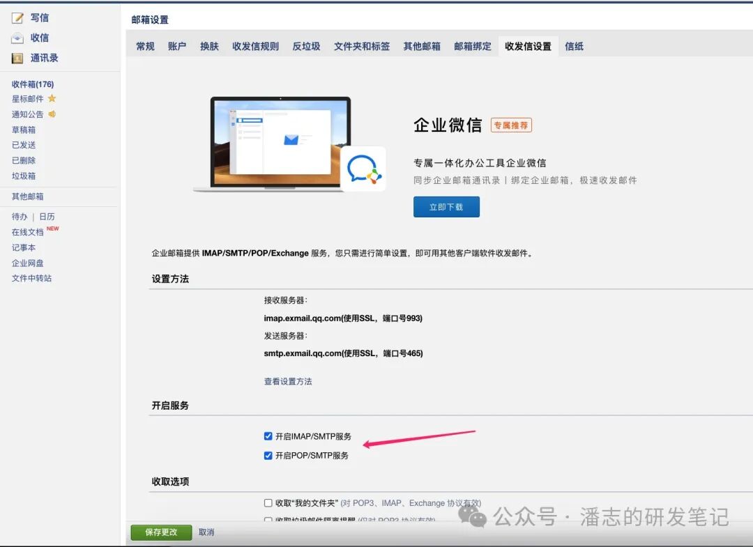 登陆腾讯邮箱,打开【设置】-》【收发信设置】,开启 SMTP 服务,最后点击【保存更改】。