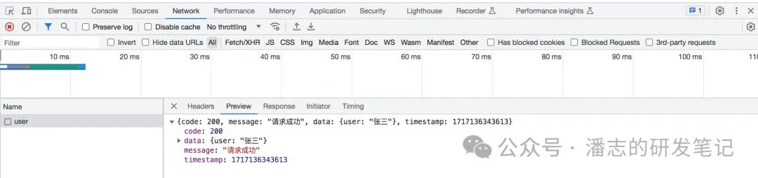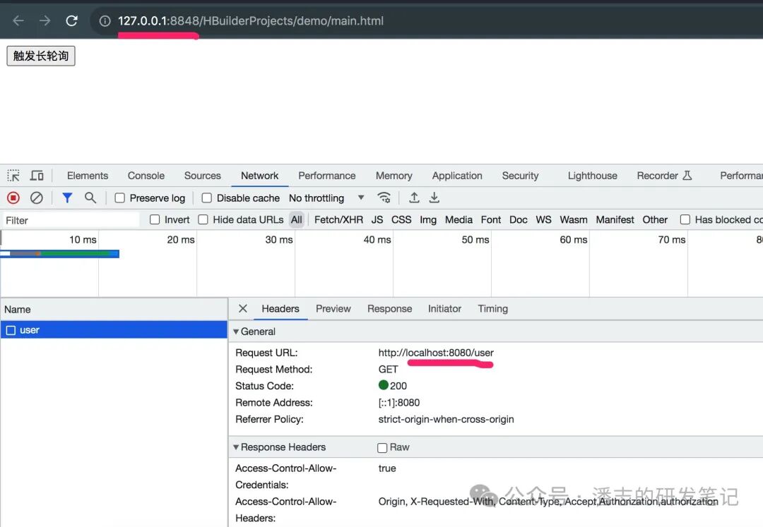 最后,启动服务后,再到浏览器中发起跨域请求,看看效果如下。