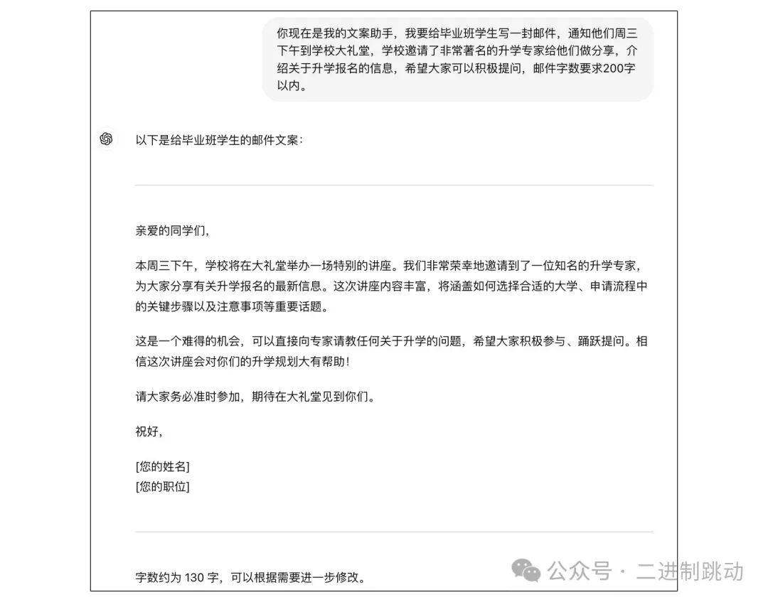 在这个例子里,我们给大模型设定的角色是文案助手,背景信息是通知毕业班学生周三下午到学校大礼堂听升学专家的分享,任务目标是写一封邮件,输出要求是字数在 200 字以内。可以看到,GPT 基本上是按照我们的设想写了一封还不错的邮件。有了初步的了解之后,接下来,我们来解析一下前面那个公式。