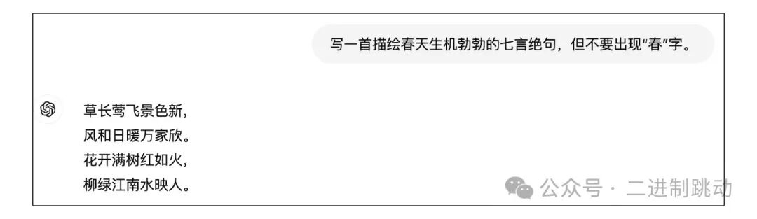 在下面这个例子里,我们要求 GPT 写一首七言绝句,它很快就生成出来了,但内容非常随机。
