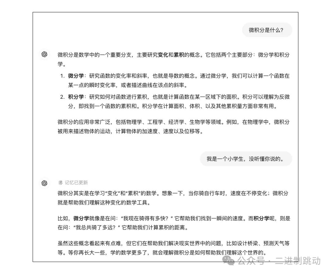 在这个例子里,我们分别扮演了成年人和小学生两个角色让 GPT 给我们解释什么是微积分。对比两段关于微积分的解释,很明显,给小学生解释的版本要更加浅显易懂。