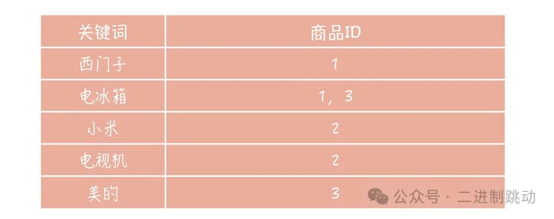 这样,如果用户搜索电冰箱,就可以给他展示商品 ID 为 1 和 3 的两件商品了。