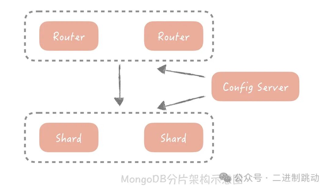其次是 Shard,也就是分片机制,可以理解为分库分表的实现。Shard 通过一定规则将数据划分为多份,并分布存储到不同的机器上。MongoDB 的分片功能通常由以下三个角色协作完成: