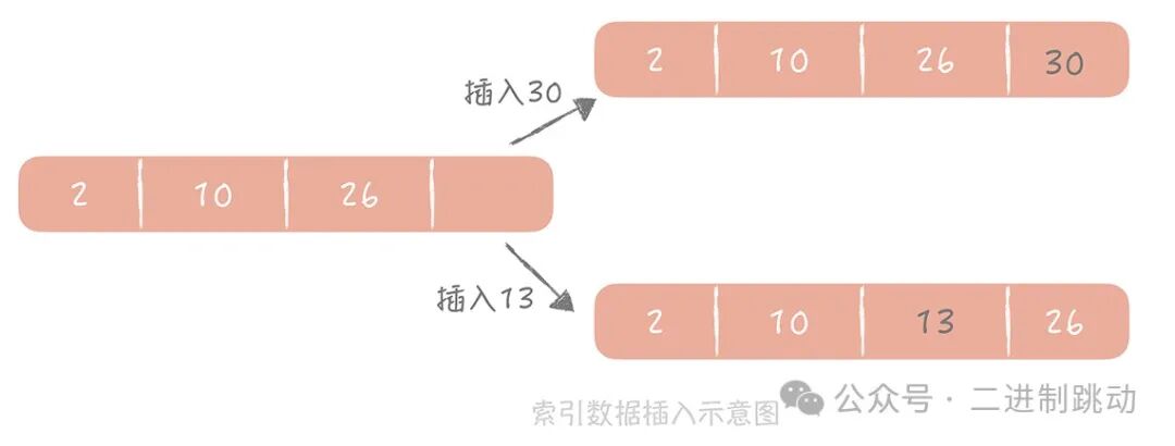 这时,当插入的下一条记录的 ID 是递增的时候,比如插入 30 时,数据库只需要把它追加到后面就好了。但是如果插入的数据是无序的,比如 ID 是 13,那么数据库就要查找 13 应该插入的位置,再挪动 13 后面的数据,这就造成了多余的数据移动的开销。