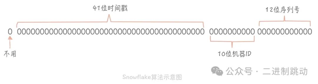 从上图可以看出,Snowflake 算法中 41 位的时间戳约等于 2 41 / 1000 / 60 / 60 / 24 / 365 2^{41}/1000/60/60/24/365241/1000/60/60/24/365 年,计算得出大约为 69 年,对于大多数系统的使用周期来说已经足够。