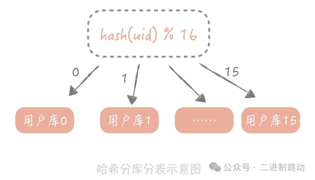 一种常见的水平拆分方法是基于某个字段的哈希值进行分片,这种方法尤其适用于实体表,如用户表、内容表等。通常,我们会选择这些表的 ID 字段作为拆分依据。
