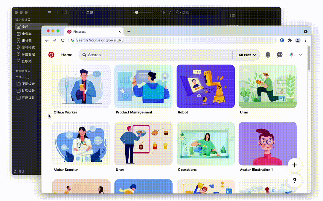 关于是我什么时候开始使用Eagle这款软件的,记得是2021年春季,我跟一位设计师朋友在一起肝图时,偶然一回眸,发现他在疯狂的收集图片素材,鼠标放在图片上,然后按住图片一拖,这张图片就被收集下来了😬,真是震惊我了,不信你看: