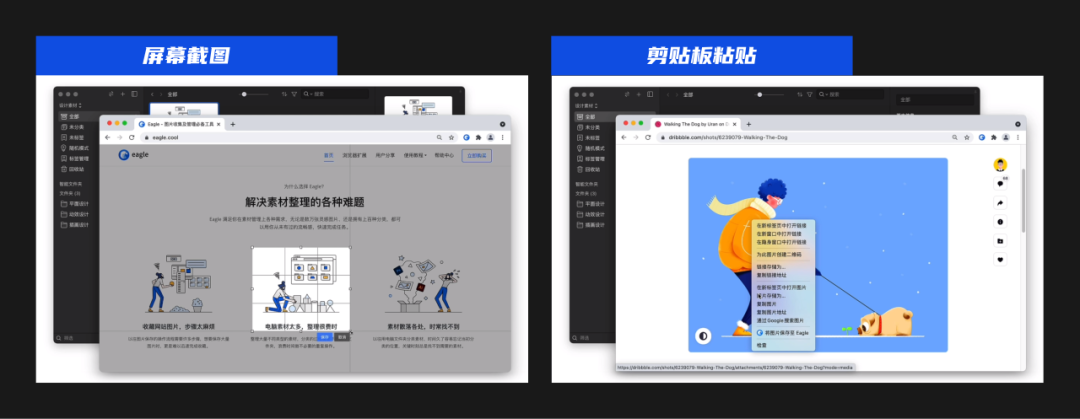 像屏幕截图、图片转移等常见功能就不说了,该有的他都有,不论你是把本地文件夹丢进去,还是直接通过复制网站上的图片粘贴到Eagle中。
