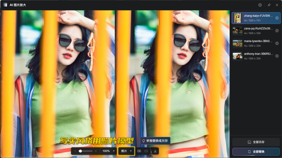 通过AI技术使得图片可无损放大至四倍以上,保持清晰度和细节,支持批量处理,提升工作效率。