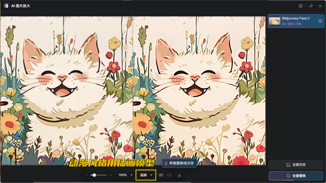 如果是一张插画风格的图片,那么我们只需要切换【插画放大模型】即可最大化保持原图细节: