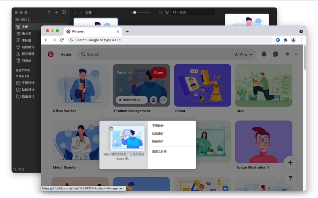 我们可以在自己的浏览器上安装Eagle插件,这样我们就可以随时在浏览过程中收集我们喜欢的照片,只需要轻轻拖动图片即可完成,这个功能我在工作中经常使用。