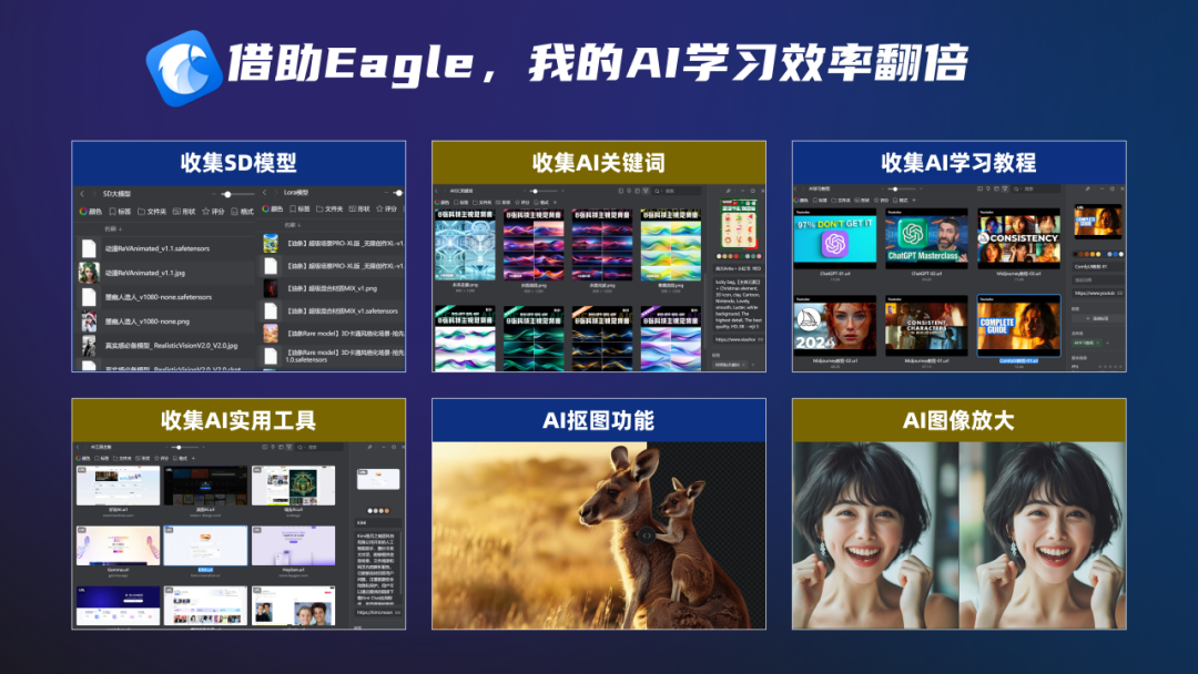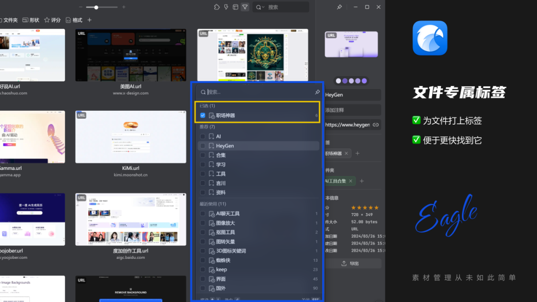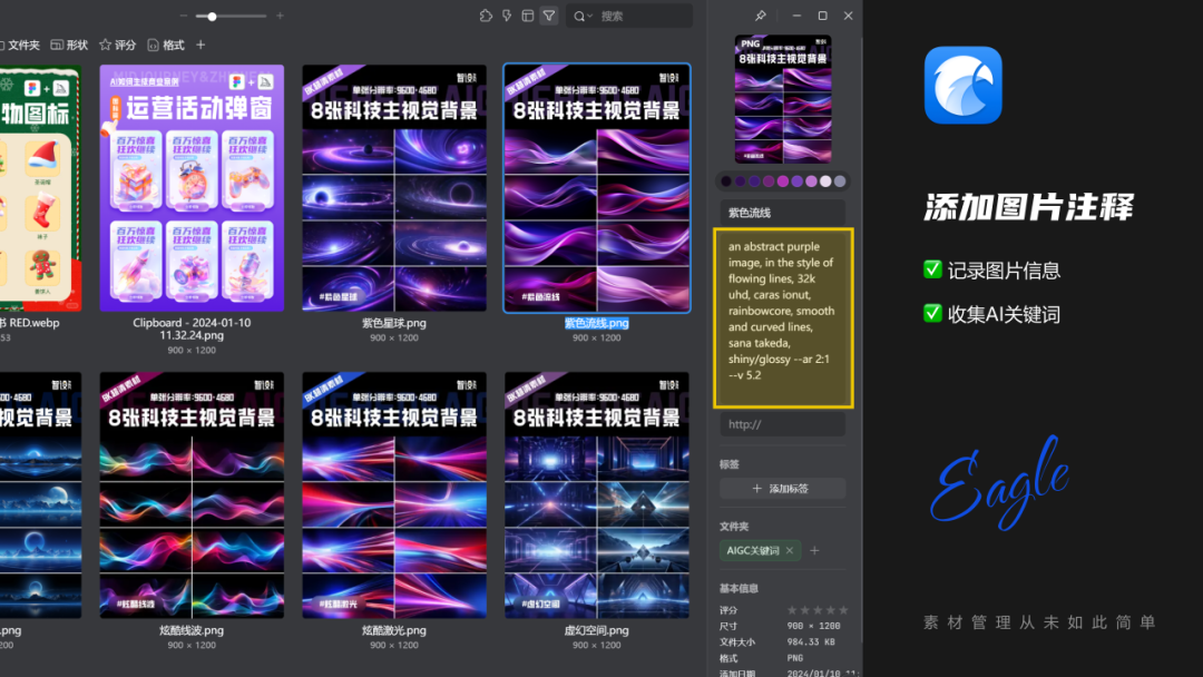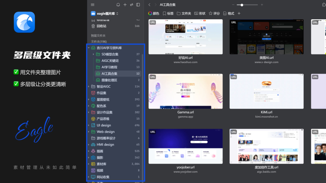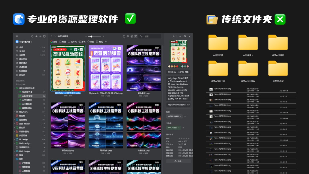 而我在近2年时间研究AIGC领域时,也是通过Eagle强大的素材整理功能,让我能快速的学会AI,并把自己所掌握的经验技巧分享给大家,工欲善其事,必先利其器,作为一个使用了3年多的老用户,在今天还是强烈推荐大家去使用这款软件,特别是每天都会与图片/视频素材打交道的设计师、自媒体玩家;